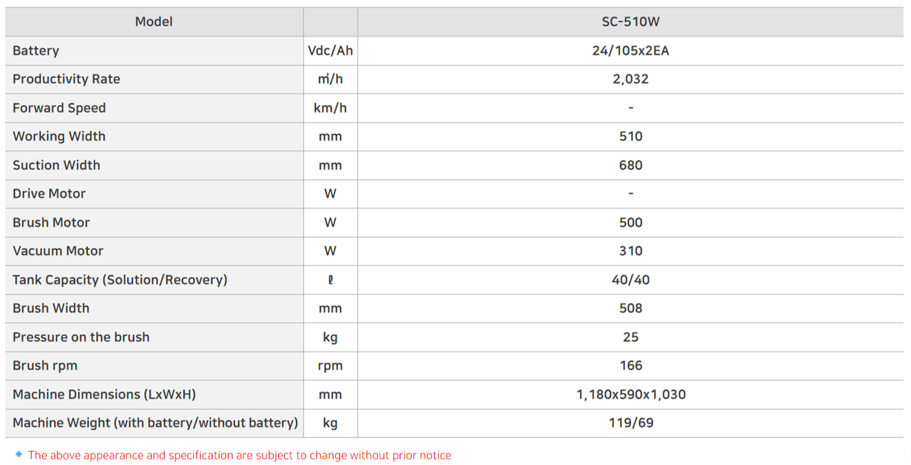 58dB low noise design allows use in public sites such as hospitals and schools There is no need to connect an electric wire, so cleaning is convenient because it operates on batteries. Efficient floor management by reducing cleaning time Brushes and squeegees can be replaced without tools