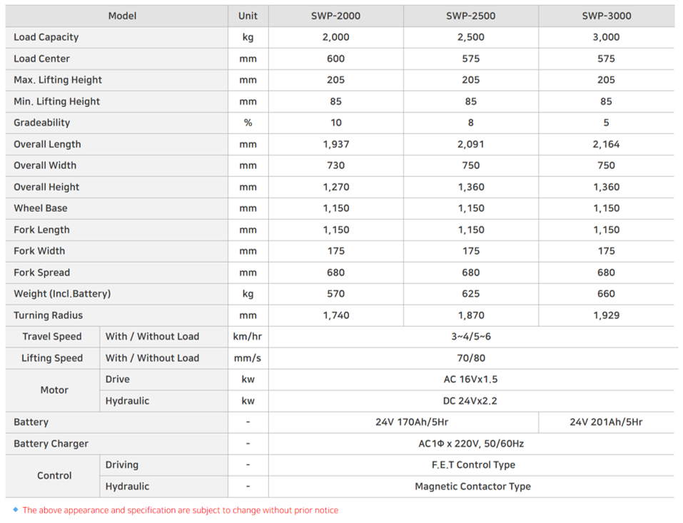 The SWP series ranges from small businesses to large-scale distribution centers. The electric pallet truck you need in any warehouse. Various lineups based on payload It guarantees the best workability with reasonable price and excellent performance.